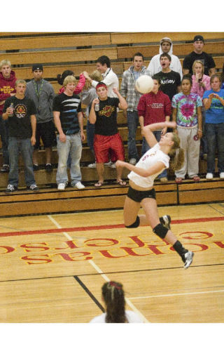 Thomas Jefferson High School senior Rachelle Eckert goes up for a spike in front of the Raider crowd Wednesday night during a match against Kent-Meridian. The Raiders were swept in three games.