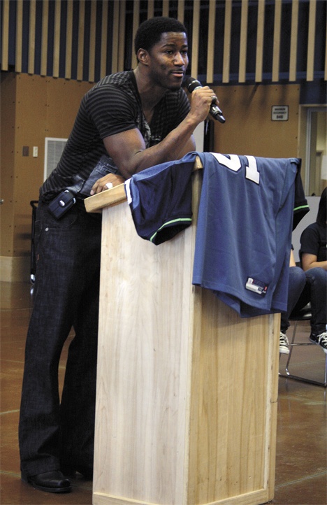 Seahawks receiver Nate Burleson speaks at Todd Beamer High School