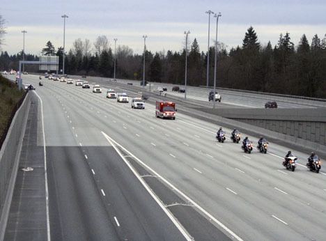 Between 30-40 local law enforcement and South King Fire and Rescue cars and rigs were lined up over the 317th Street and 320th Street overpasses at Interstate 5, lights flashing. In the half hour preceding the motorcade, thousands of cars and semis honked. A few dozen members of the public also came out in the freezing cold to stand at the overpass to watch and show support.