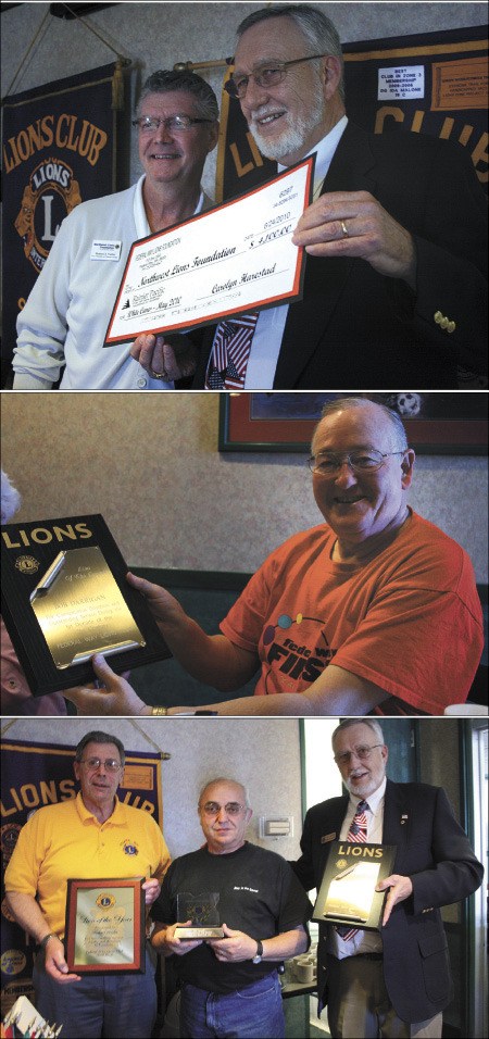 On July 6, Federal Way Lions President Paul Gersper presented a check for $4,100 to Robert J. Vatter of the Northwest Lions Foundation for Sight and Hearing. Bob Darrigan was named Lion of the Decade. Mike Persha was named Lion of the Year, and Lee Papini received a Distinguished Service Award.