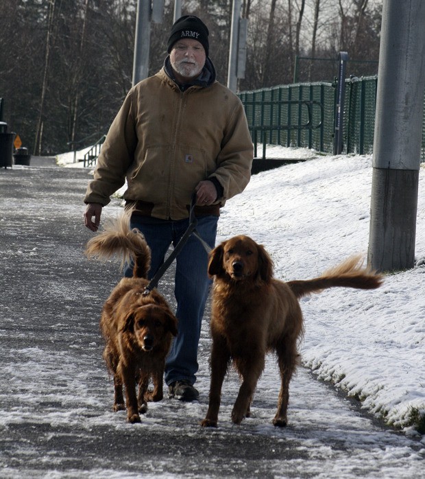 Wednesday’s early morning snow flurry brought a few inches of snow to some South Sound locations. However, Federal Way experienced only a dusting and temperatures remained mostly above freezing. Pictured above: Federal Way resident Ken Wilcox walks his dogs Beau and Annie in Celebration Park on Wednesday afternoon. Snow and some ice were scattered across the park’s grounds for most of the day.