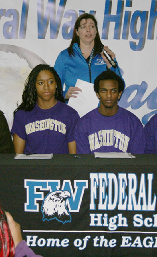 Meron Simon — The Federal Way senior will compete on the University of Washington cross country and track teams starting in the fall. Simon inked his letter of intent at a ceremony Thursday morning at Federal Way.