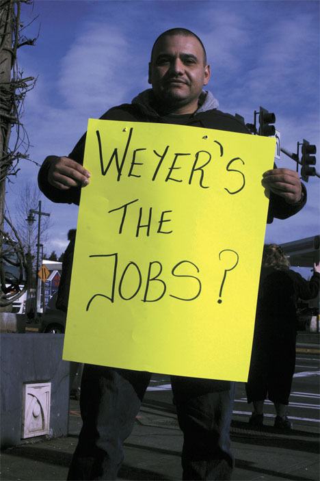Just before Tax Day, members of labor unions and advocacy groups waved signs and hung banners on freeway overpasses. Protesters passed out fliers, and a handful of Service Employees International Union (SEIU) representatives attended a shareholders meeting at Weyerhaeuser’s headquarters in Federal Way. At South 320th Street and Pacific Highway, one protester hoisted on his shoulders a stuffed mannequin with a picture of Weyerhaeuser CEO Dan Fulton’s face.