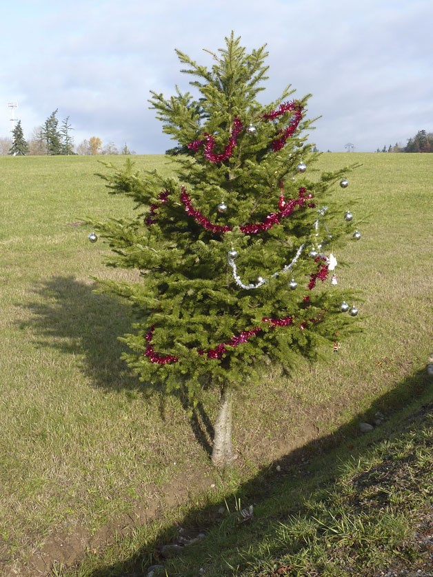 The tree usually sits there along South 336th Street all alone, but some mysterious person has chosen to decorate it for the holidays.
