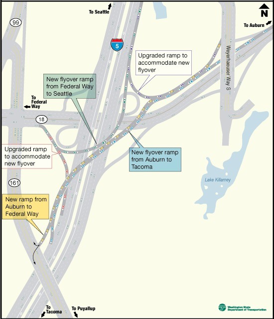 Direct access will be provided to Highway 161 from southbound I-5 and westbound Highway 18 through the construction of new exit ramps at South 356th Street and South 359th Street in Federal Way.