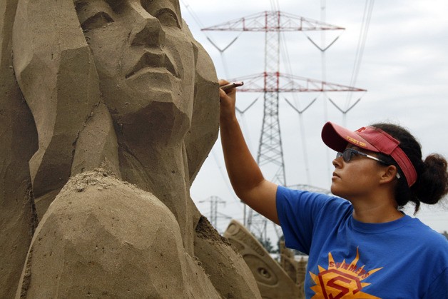 Sue McGrew of Tacoma works on her sculpture at the Northwest Sand Festival. She won third place in the solo division.