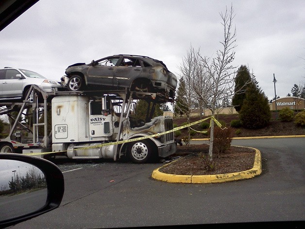Federal Way resident Scott Chase emailed this photo, taken by his wife Lesa, of charred vehicles in a local parking lot. He inquired about the cause of the fire and whether the truck driver was OK.
