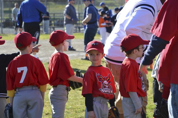 Members of the Owlz Federal Way National T-Ball team wait patiently to take part in the jamboree ceremonies Saturday at the league's complex. The jamboree included all the team from Federal Way National.