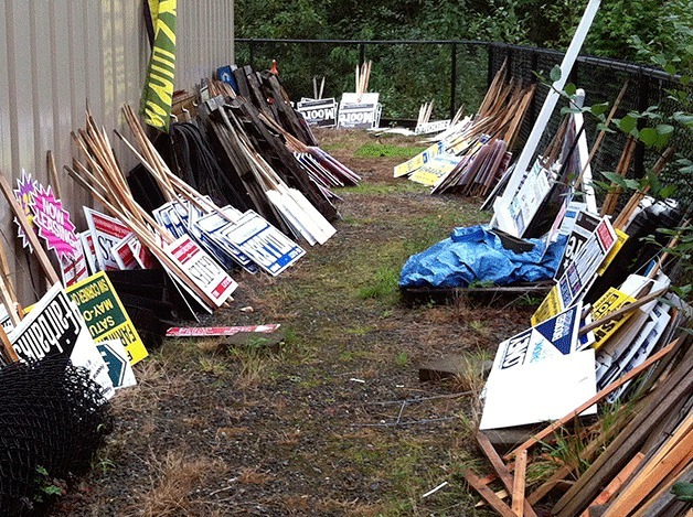 The city stores confiscated signs at the sign jail that are illegally placed in the city. Sign owners must pay a fine to get the signs back.