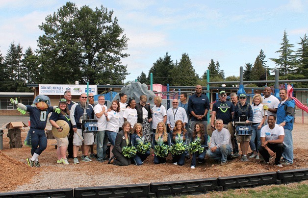 Former Seahawks, United Way volunteers help upgrade Federal Way school playground | Slideshow