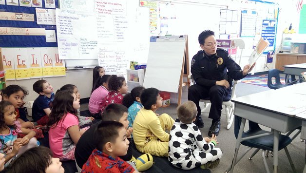 Hwang read the Dr. Seuss book to Sheila Cadena’s first grade class. After reading the book, Hwang shared with the class about his job as chief and the equipment that he wears on the job. He also told them that they can achieve anything in life and go places, if they work hard, are disciplined and do well in school.