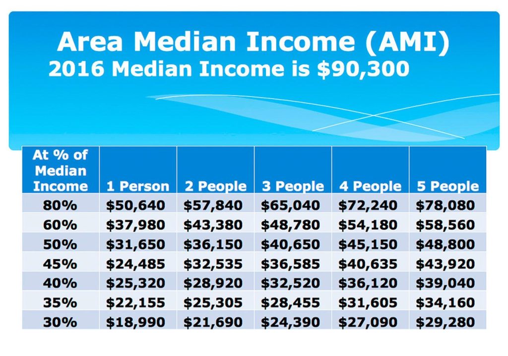 In order to qualify for moderate income housing, a person needs to make between 51 and 80 percent of the King County Area Median Income. Low-income housing requires 31 to 50 percent of the Area Median Income, and very low-income affordable housing is 30 percent or below the Area Median Income. As of 2016, the King County Area Median Income is $63,210 for one person and $90,300 for a four-person household.