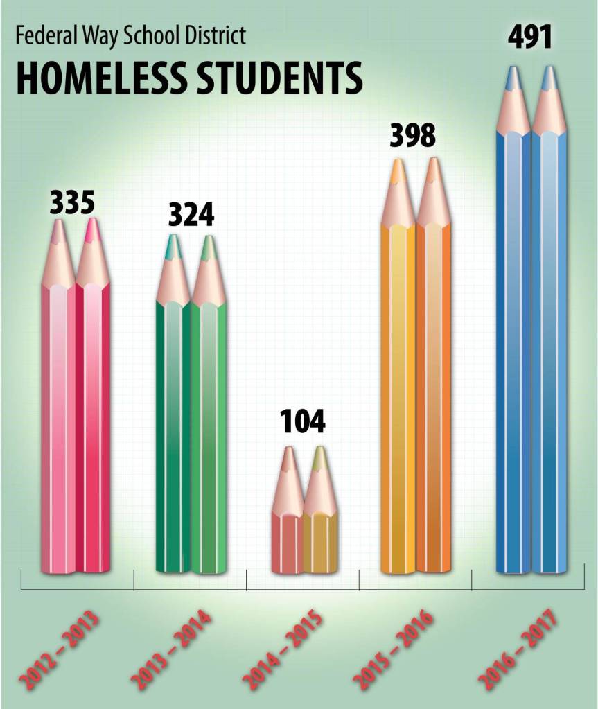 Federal Way Public Schools recently announced the number of homeless students in the district has risen by 46.5 percent over five years. In the 2016-17 school year, the district reported 491 homeless students. In the 2013-12 school year, the count was 335.