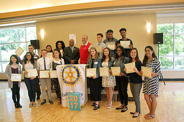 Rotary Club of Federal Way celebrated the 2017 class of scholarship recipients at the annual Scholarship Luncheon, awarding more than $20,000 to 17 Federal Way graduating scholars. Pictured, front row from left: Sara Ichinaga, Helena Ochoa Moreno, Alex Argyle (Al Vaux Scholarship), Hana Lee, Kenzi Nestor, Monserrat Cordoba Zumaya, Blessing Ayemere, Jessica Luu and Gurleen Bassi. Back Row from left: Denis Bezus, Katherin Guzman, Savanah Tyson-Yarbrough, Rotarian Bob McKensie, School Board President Geoffrey McAnalloy, Austin Bass, Caleb Coleman and Michael Edwards. Not shown: Brenda Gonzalez and Avery Liening. Contributed photo