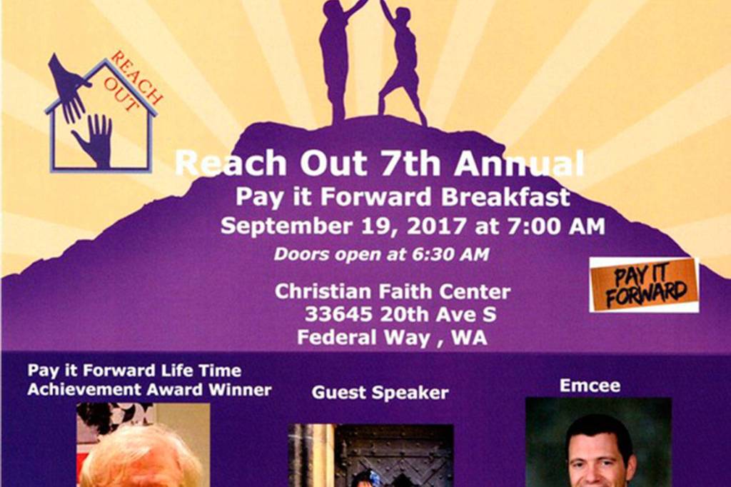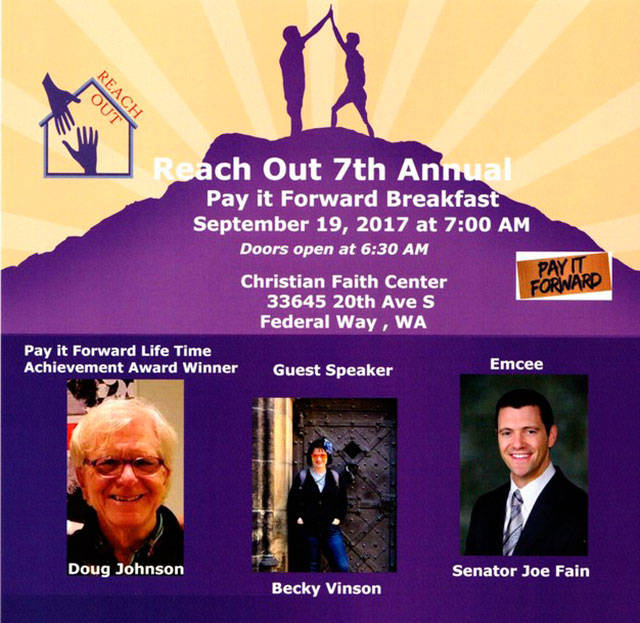 Reach Out’s seventh annual fundraising breakfast will be taking place from 7 to 8:30 a.m. Sept. 19 at the Christian Faith Service, 33645 20th Ave. S, Federal Way. Doug Johnson will be honored as the Pay it Forward award recipient for a lifetime of supporting the less fortunate in the Federal Way community. Reach Out, a program of Catholic Community Services of Western Washington, is hosting this year’s fundraiser to offset operation costs for the six-month shelter program. All proceeds from the breakfast will be used to provide intake and screening of potential clients, overnight supervision and case management for homeless adults as they strive to obtain permanent housing and become self-sufficient. Becky Vinson, this year’s featured speaker, will also share her story on overcoming homelessness, and of a man she sheltered, and later adopted. To register for this event visit reachoutfederalway.org.