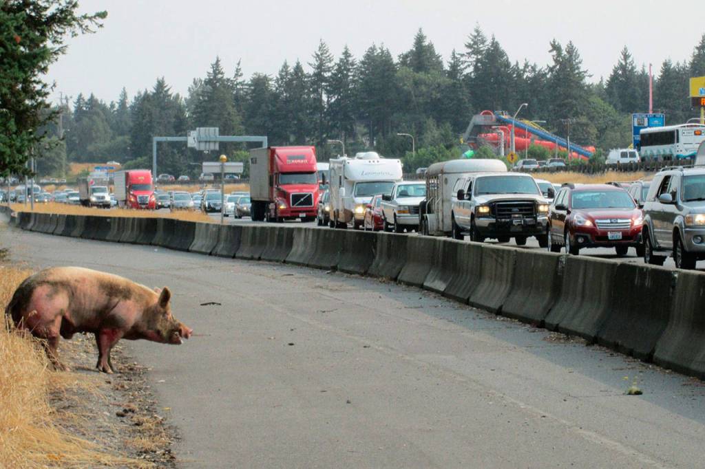 The pig was on the way to auction when it escaped around 10 a.m. Saturday, Aug. 5, on southbound I-5 near a weigh station. A few citizens helped state troopers get the pig off the road’s shoulder, according to Trooper Rick Johnson of the Washington State Patrol.