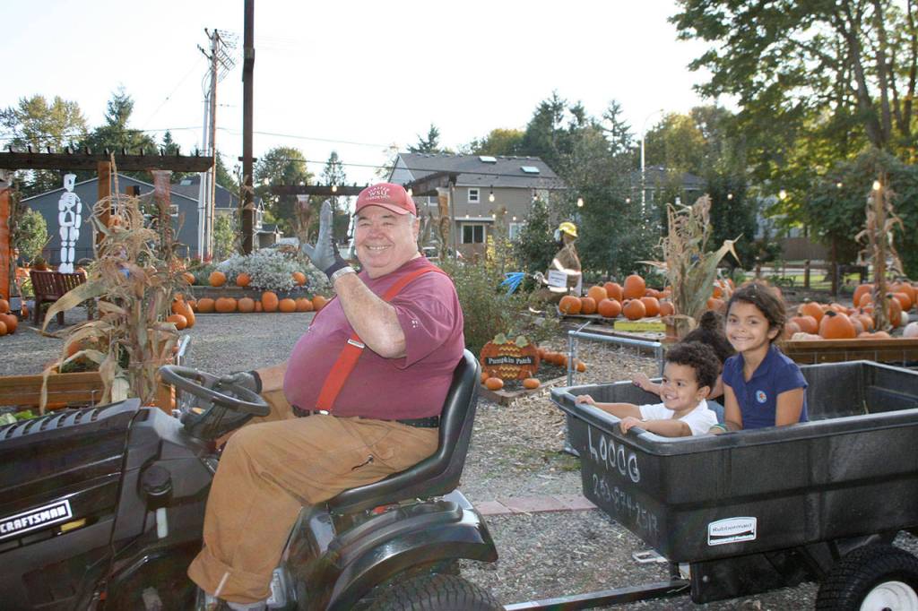 Jim Cox — who is the garden project manager along with his wife, Donna — enjoys taking young visitors to the pumpkin patch on hay rides using the garden’s tractor.