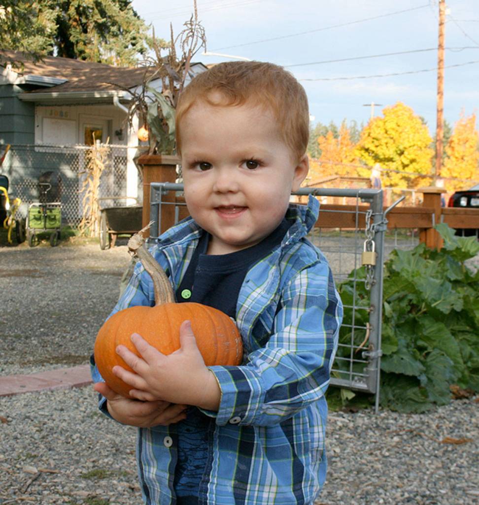 Matthew McKell, 2, of Federal Way, holds a pumpkin he picked out at the Light of Christ Community Garden on Monday afternoon. HEIDI SANDERS, the Mirror