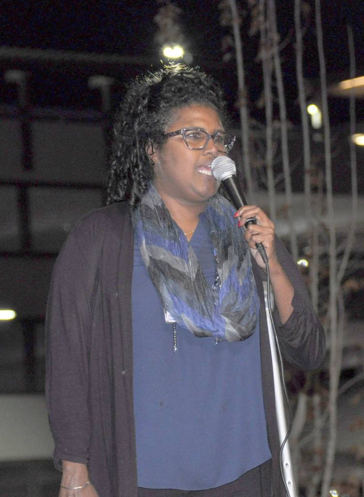 Federal Way City Councilwoman Lydia Assefa-Dawson spoke to students at the rally. Her son, Caleb Dawson, helped spearhead the food drive his freshman year and continued to organize similar events while away at college.