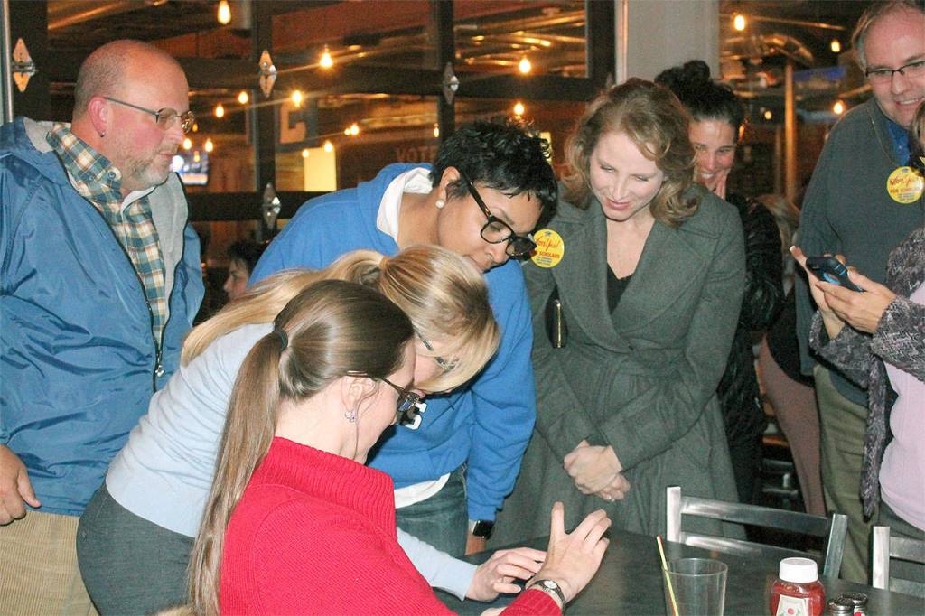 Federal Way Public Schools Superintendent Dr. Tammy Campbell, center, and other district supporters and staff gather to check early election results at a gathering hosted by the Citizens for Federal Way Schools Tuesday at Billy McHale’s in Federal Way. As of Wednesday afternoon, the district’s $450 million schools bond was no closer to passing. Results in local council races, however, show frontrunners have either maintained their leads or pulled ahead further. JESSICA KELLER, the Mirror