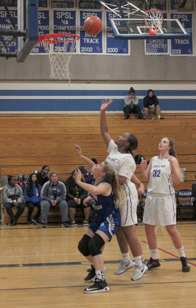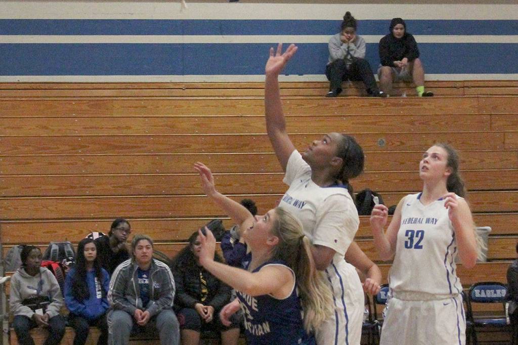 Federal Way High School freshman forward Jazmine Bazille shoots the ball over Cascade Christian defenders in the Eagles’ season opener Tuesday at home. Despite keeping the game close through three quarters, the Eagles could not hold off the Cougars, who ran away with a 42-32 win in their nonleague game. Federal Way takes the court against Bonney Lake at home Thursday. JESSICA KELLER, the Mirror