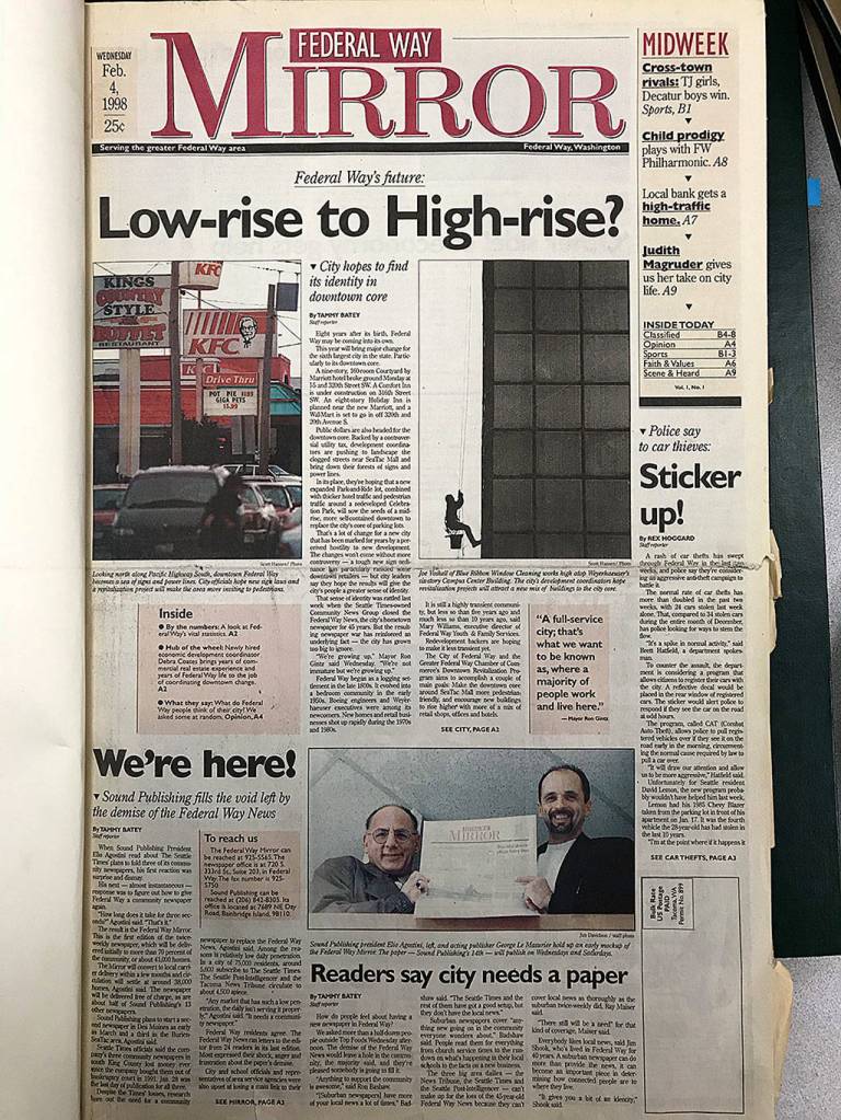 As published in the Federal Way Mirror’s inaugural edition Feb. 4, 1998, along with the community improvements and development, the city would have a clearly defined downtown sector and find its identity in its downtown core. To help that along, the city of Federal Way and Greater Federal Way Chamber of Commerce created a Downtown City Revitalization Program. According to the article, the program “aims to accomplish a couple of main goals: Make the downtown core around SeaTac Mall more pedestrian-friendly, and encourage new buildings to rise higher with more of a mix of retail shops, offices and hotels.”