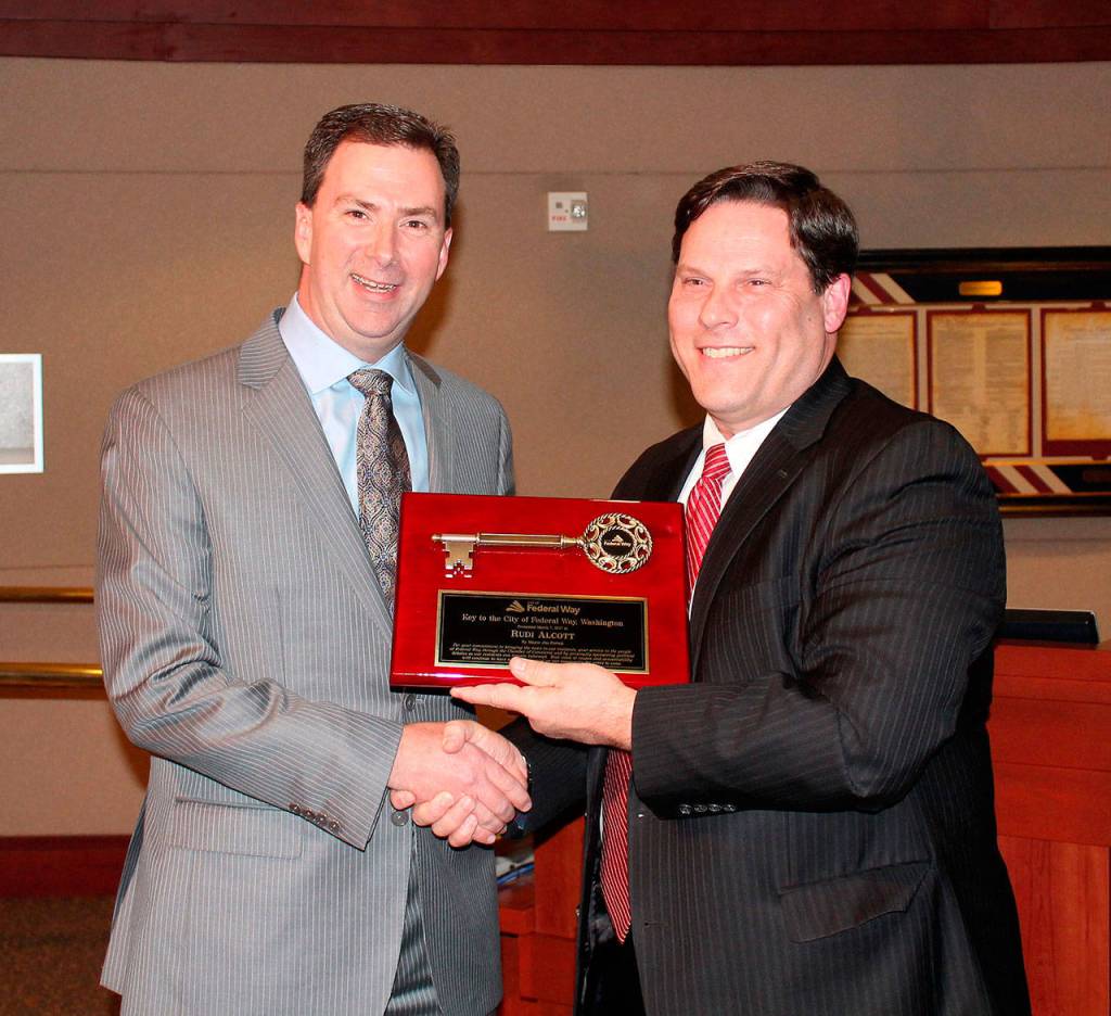 Former Mirror publisher Rudi Alcott, left, received the Key to the City from Mayor Jim Ferrell in March 2017. Alcott accepted a position within Sound Publishing’s digital sales division after leading Federal Way’s newspaper of record for nine years. FILE PHOTO