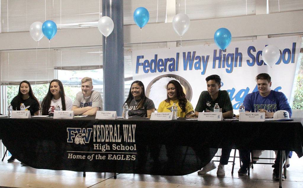 Family, friends and classmates celebrated the successes of seven Federal Way High School athletes who signed letters of intent to play college athletics in a special assembly Wednesday at Federal Way High School. Seven Federal Way High School athletes who signed letters of intent were recognized: Chaella Galabon, from left, Molly Saeda, Evan Brewer, Tupo Lologo, Lolohea Makaafi, Daniel Gomez and Mark Wright. Galabon will play softball at Pacific Lutheran University in the fall. Saeda has committed to play volleyball at the University of Puget Sound. Brewer has signed to play soccer at Tacoma Community College. Tupu Lologo signed to play volleyball at Western Washington University in the fall. Makaafi will play rugby at Lindenwood University. Gomez will play soccer at Highline College. Wright committed to play baseball at Edmonds College. Not pictured is Raquel Prado-Huerta who will play soccer at Tacoma Community College. JESSICA KELLER, the Mirror