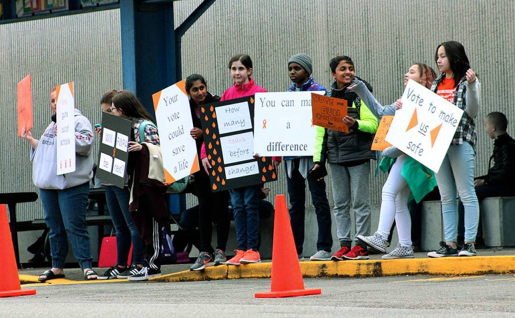 Students at Federal Way Public Academy wave signs advocating for protecting children and ending violence at schools at the end of classes Wednesday afternoon. In addition to their afternoon activities, about 93 FWPA students participated in a walkout at 10 a.m. for National School Walkout Day, which was organized by seventh-grader Natalie Wilson. JESSICA KELLER, the Mirror