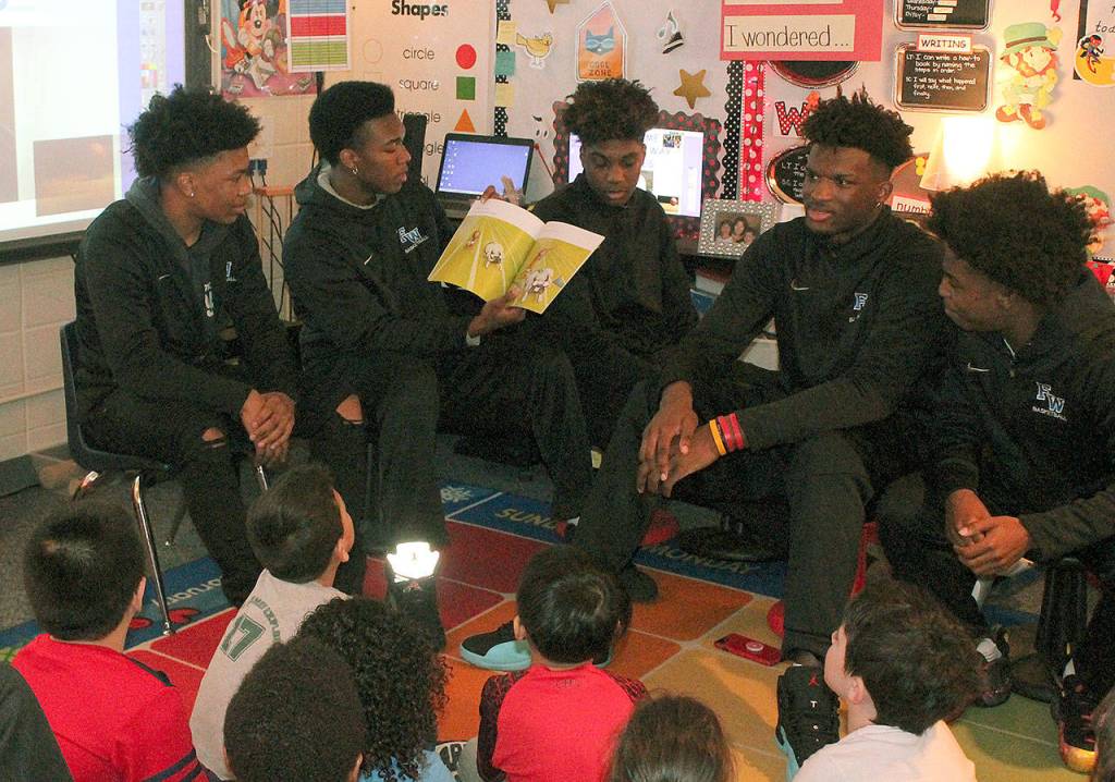 Federal Way High boys basketball players celebrate Literacy Week with Adelaide students