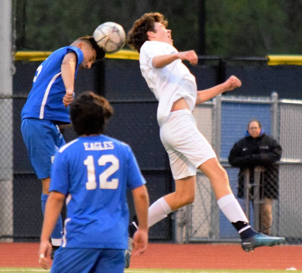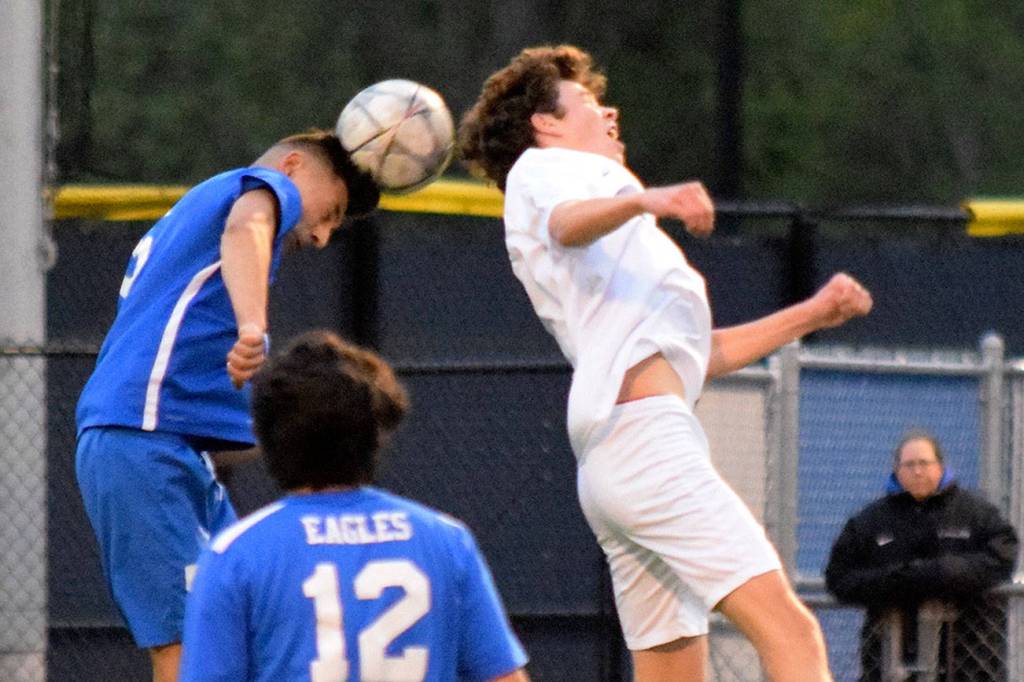 Auburn Riverside’s Sam Erickson, right, blocks Federal Way High School’s Usbaldo Estrada, left, during the Eagles’ 2-0 loss to the Ravens April 27. Federal Way (10-2-2, 11-3-2 overall) finished the regular season in second place in the 4A North Puget Sound League Olympic Division behind Auburn Riverside. Rachel Ciampi, Auburn Reporter