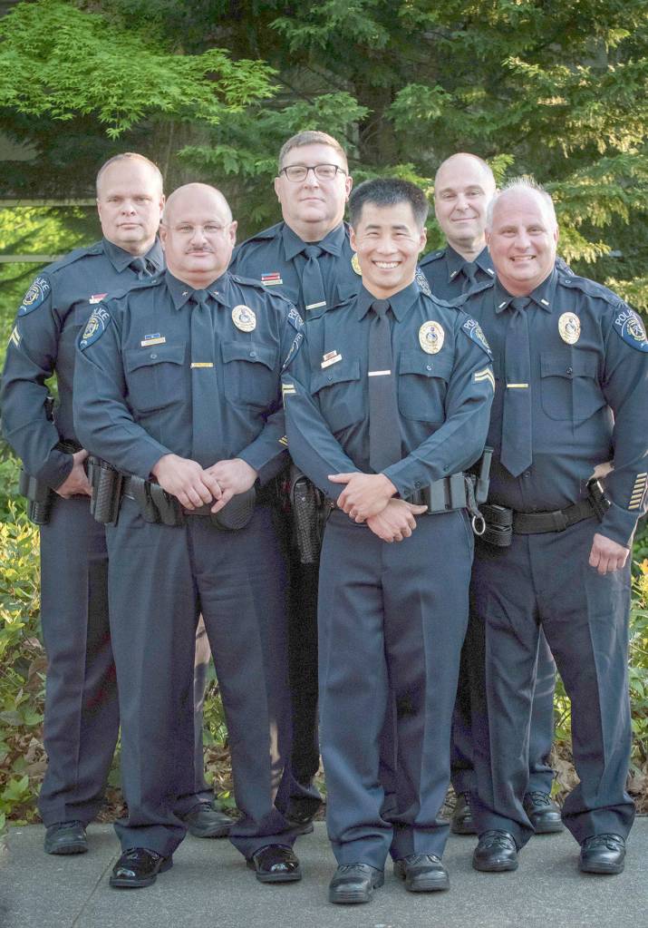 The Federal Way Police Department on Tuesday promoted three individuals and appointed three others to corporal. Pictured from left are: Cpl. Grant Bassett, Cmdr. Tracy Grossnickle, Cpl. Chris Mickelsen, Cpl. Jed Tan, Lt. Steve Wortman, and Lt. Bryan Klingele. Courtesy Federal Way Police Department