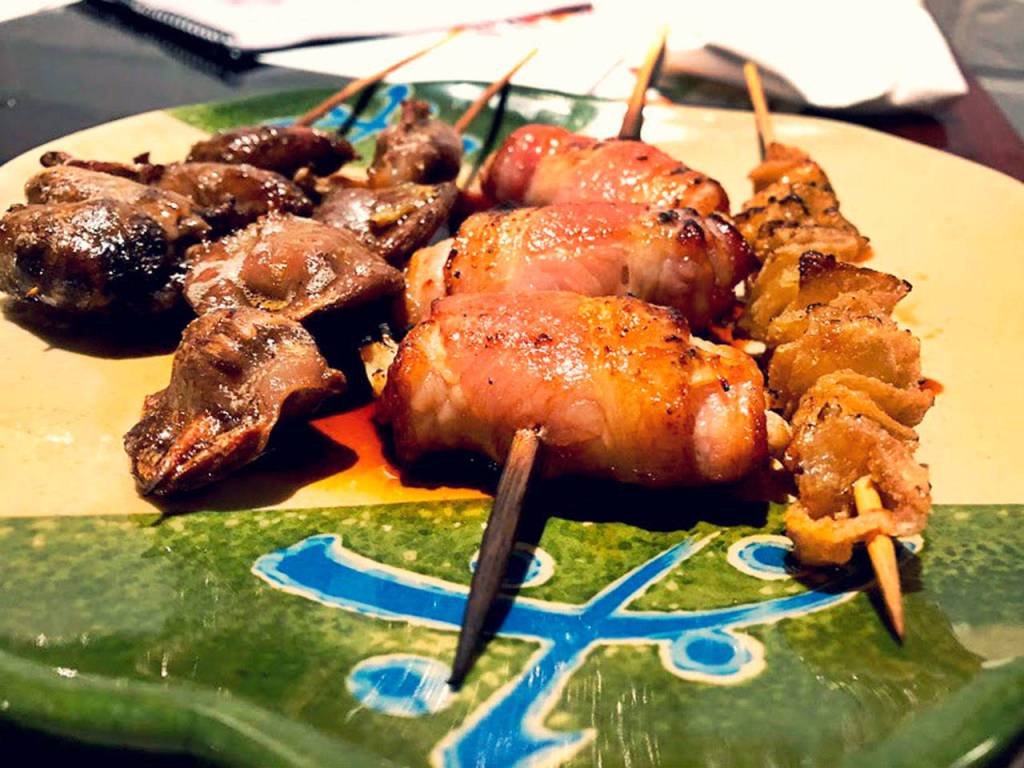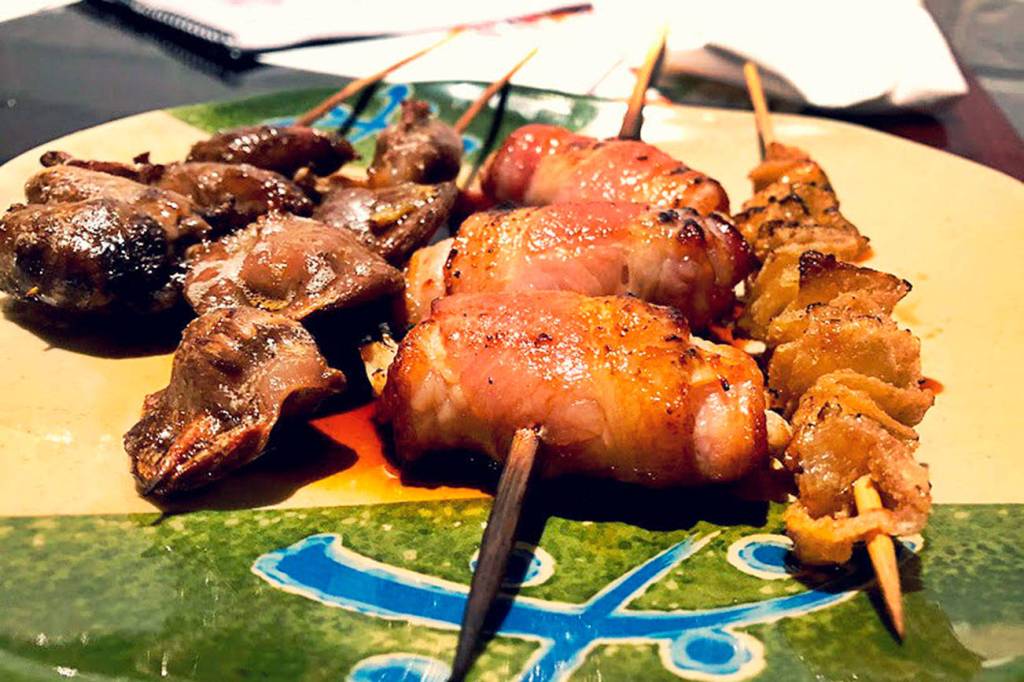 Picture chicken skin sliced into tiny cubes and run through with a skewer at the center so it looks like a monkey puzzle tree, only crispy and delicious. Imagine gizzards all springy and marbled with juice and smoke. Picture a chicken heart. It’s probably the hardest one to hurdle if you’ve never had it before, because it looks like, you know, a heart. But rock your brain out of the ditch and take a bite. Tender, smokey, wild. If you can get one of those crispy nuggets past your lips, you’ll pound 14 of them faster than you can say cognitive dissonance.