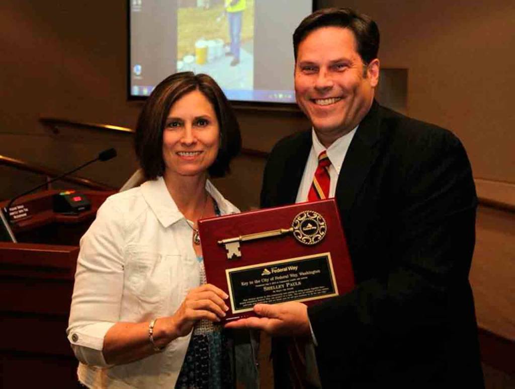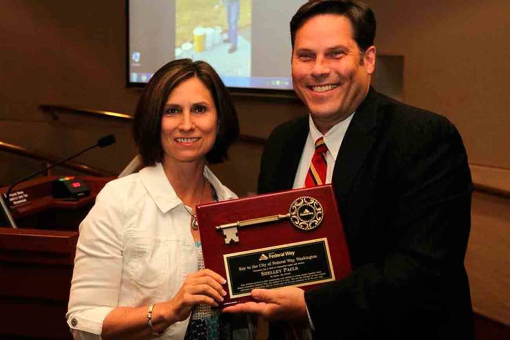 Longtime community leader and volunteer Shelley Pauls received the Key to the City from Federal Way Mayor Jim Ferrell at Tuesday night’s city council meeting.