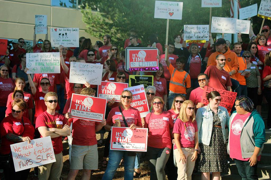 At rallies held this week before the Federal Way School Board meeting Aug. 28, and last week before a bargaining session on Aug. 24, hundreds of teachers, parents, kids and community members gathered to show support for the Federal Way Education Association.