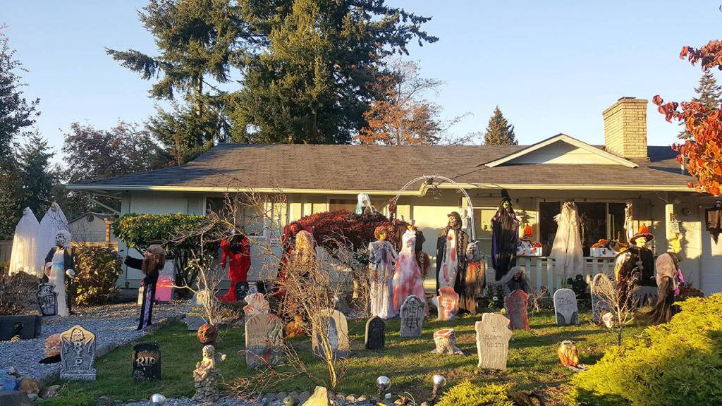 A large Halloween display shows a haunting zombie wedding in Laura Newcombe’s front yard. Newcombe is collecting canned good donations for Multi-Service Center’s Food Bank. Photo courtesy of Laura Newcombe