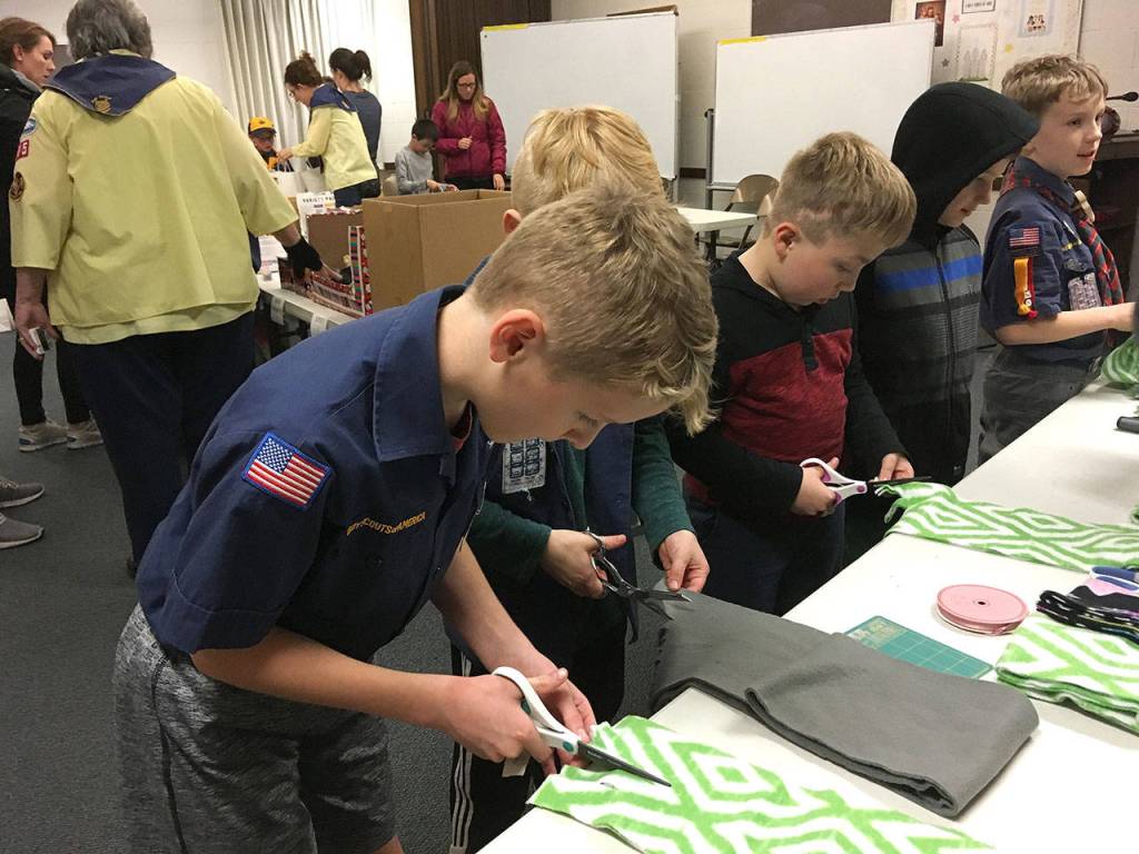 Cub Scout Packs 301 and 305 assembled care kits on Dec. 11 for those in need who visit the Federal Way Day Center. The kits included hygiene items, gloves, hats, hand warmers, socks and snack foods The boys also made fleece scarfs to add to the kits.