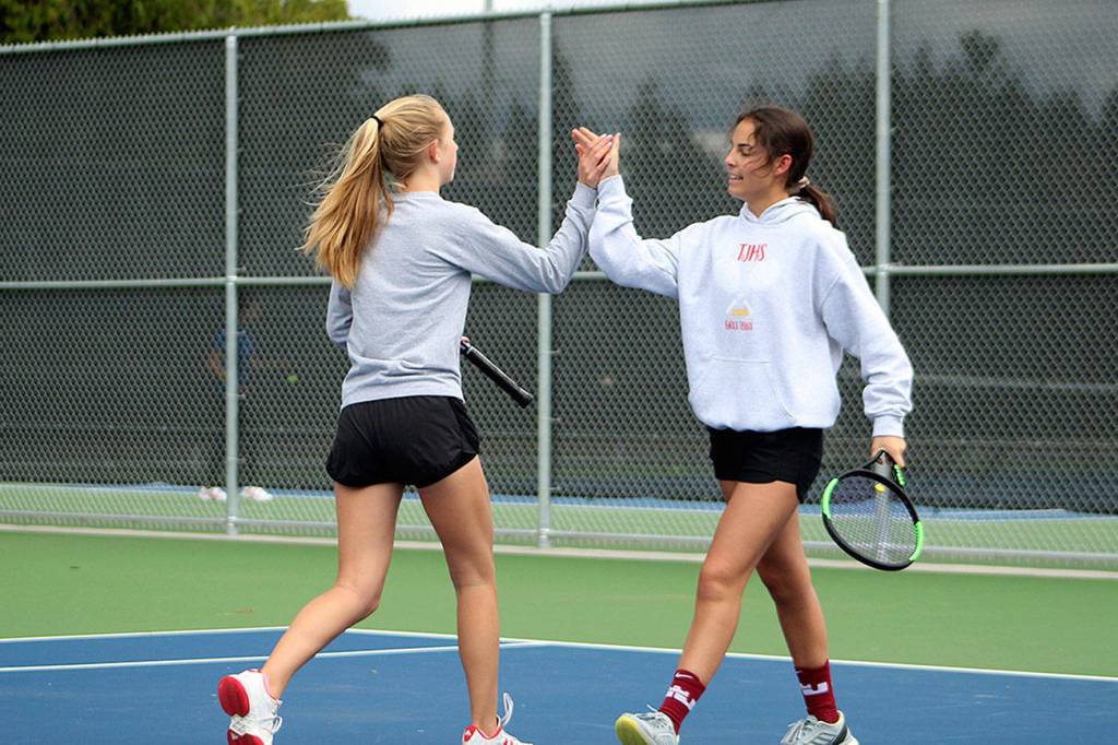 Thomas Jefferson girls tennis team celebrated their 20th league victory after a 5-0 win over Federal Way on Tuesday.