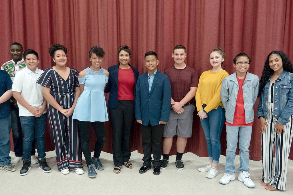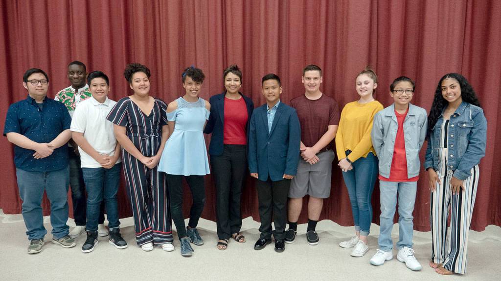 Federal Way Public Schools Superintendent Dr. Tammy Campbell, center, stands with 10 scholars who recently received scholarships from the Federal Way Lions Club. Courtesy photo