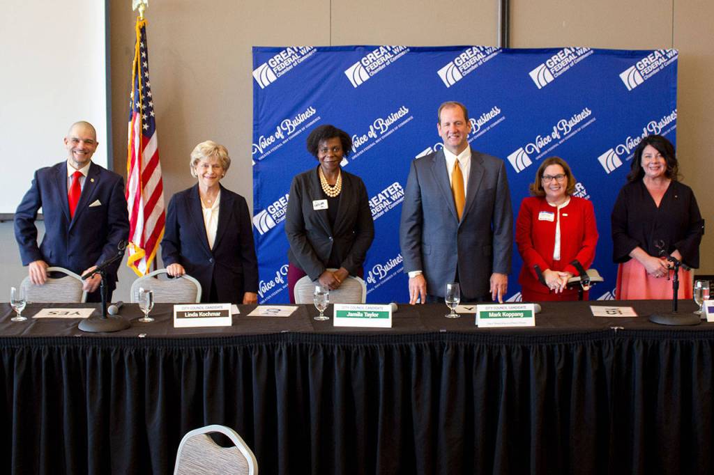Federal Way City Council candidates vying for three contested seats on the council this November addressed public safety, the city’s strong mayor form of government and ways to reduce permitting challenges in the city during the Greater Federal Way Chamber of Commerce’s forum on Wednesday at the Federal Way Performing Arts and Event Center.