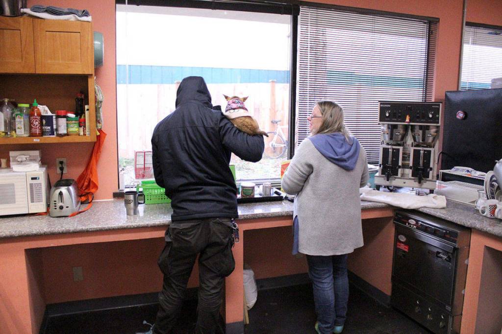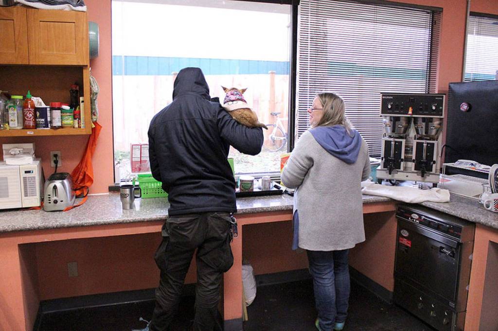 Two clients chat in the kitchen at the Federal Way Day Center as a Chihuahua named Princess looks out the window on Jan. 2, 2019. The Federal Way Mirror’s “Humanizing Homelessness” series won a first place award in best comprehensive coverage in the Washington Newspaper Publishers Association’s 2019 Better Newspaper Contest. File photo