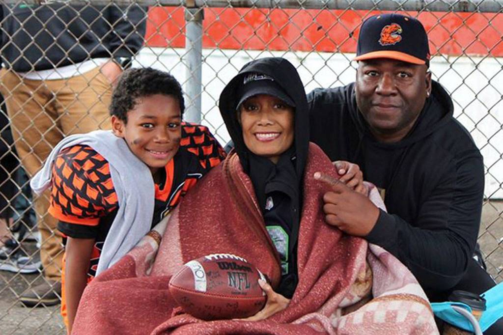 Liny Dannis Frost smiles with her husband, Lavell, and son, Malachi, at the Federal Way Hawks’ final home game while holding the game ball given to her after her son’s touchdown. Liny died earlier this month from cancer. Courtesy photo