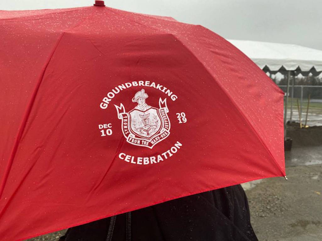 Under the protection of a red commemorative umbrella, Superintendent Tammy Campbell welcomed and thanked a crowd to the groundbreaking ceremony on Dec. 10.
