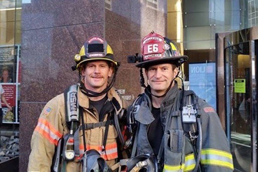 Eric Rickert of Bellevue Fire, right, stands with his younger brother Ed Rickert of South King Fire before the 2018 LLS Firefighter Stairclimb at the Columbia Center. Courtesy photo