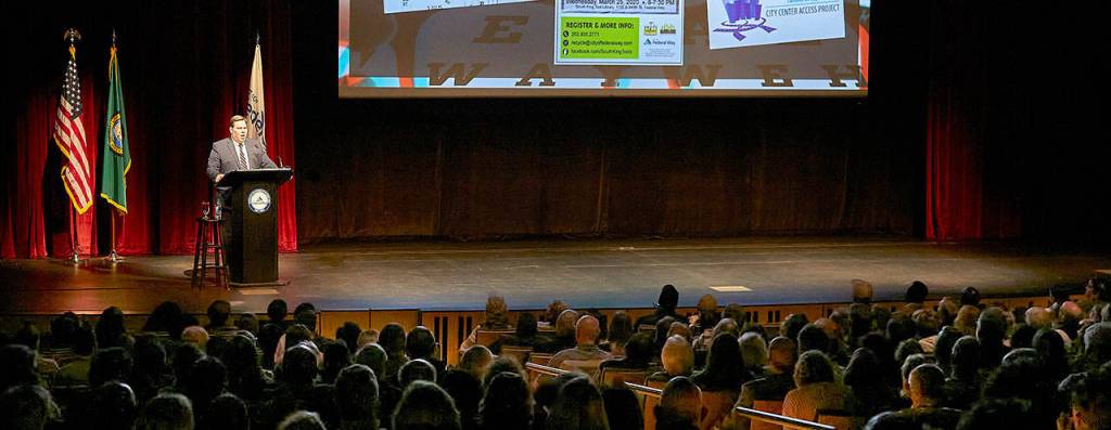 Mayor Jim Ferrell, in front of a packed auditorium on Feb. 27, told Federal Way residents about the vision he has for the city in 2020 and beyond. To go along with the 20/20 vision theme of the evening, city staff handed out 3-D glasses for audience members to use during Ferrell’s presentation.