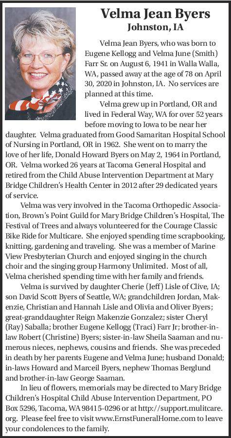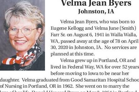 Velma Jean Byers, who was born to Eugene Kellogg and Velma June (Smith) Farr Sr. on August 6, 1941 in Walla Walla, WA, passed away at the age of 78 on April 30, 2020 in Johnston, IA. No services are planned at this time.