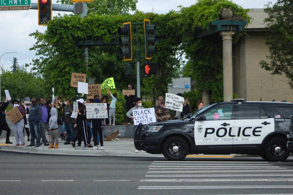 Federal Way’s demonstration event was held to protest the May 27 death of George Floyd, a black man in Minneapolis who died after a white officer knelt on Floyd’s neck for nearly eight minutes as Floyd said “I can’t breathe.” The officer has since been charged with third-degree murder and manslaughter.