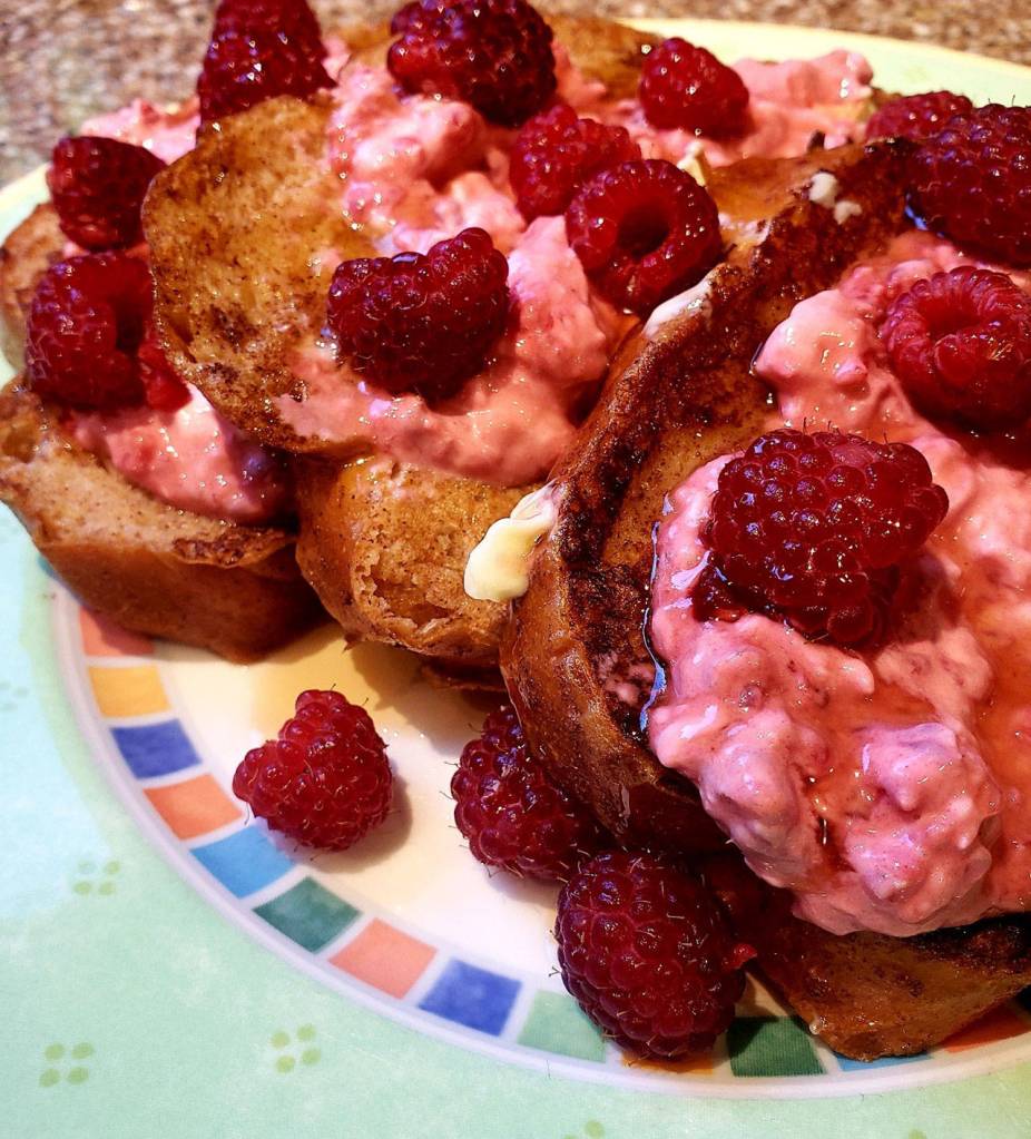 To serve, place three slices of French toast on a serving plate. Spoon one tablespoon raspberry cream cheese spread in between slices. Top with maple syrup and fresh raspberries from the Federal Way Farmers Market. Makes four servings.