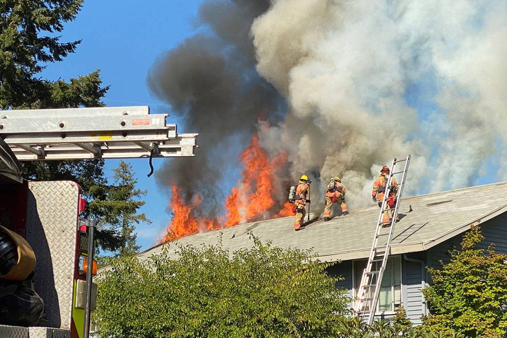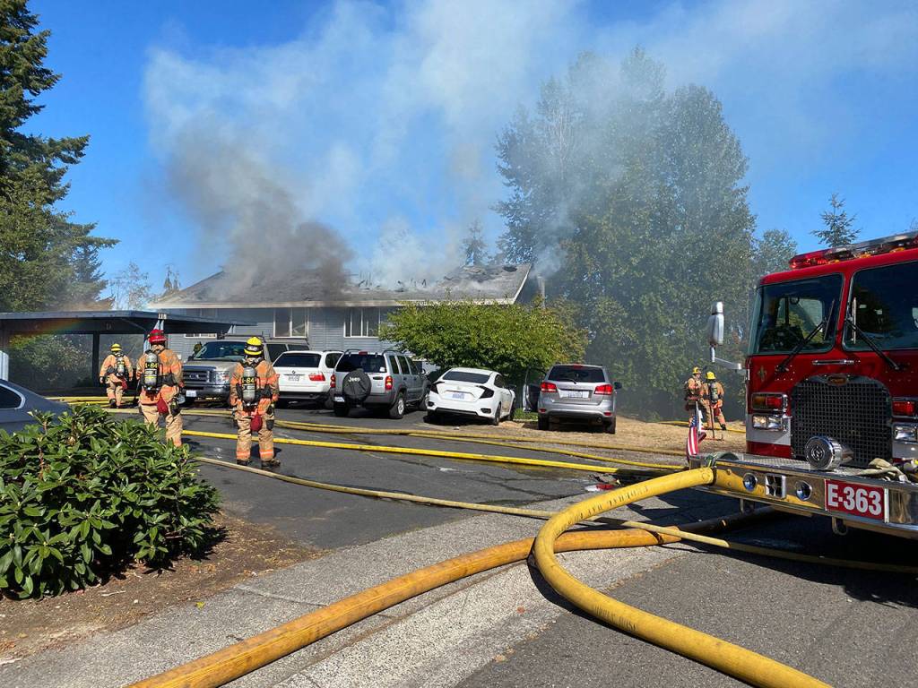 At about 4 p.m. on Aug. 26, South King Fire & Rescue crews were dispatched to reports of smoke on the patio of an apartment in the 100 block of S. 339th Circle in Federal Way. Upon arrival, flames had made their way to the attic and were visible above the four-unit complex.