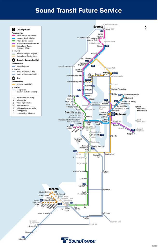 In 2024, light rail will run to Federal Way, Shoreline, Mountlake Terrace, Lynnwood and Downtown Redmond. Further regional light rail extensions are planned to reach West Seattle, Seattle Center, South Lake Union, Ballard, Paine Field, Everett, South Kirkland and Issaquah.